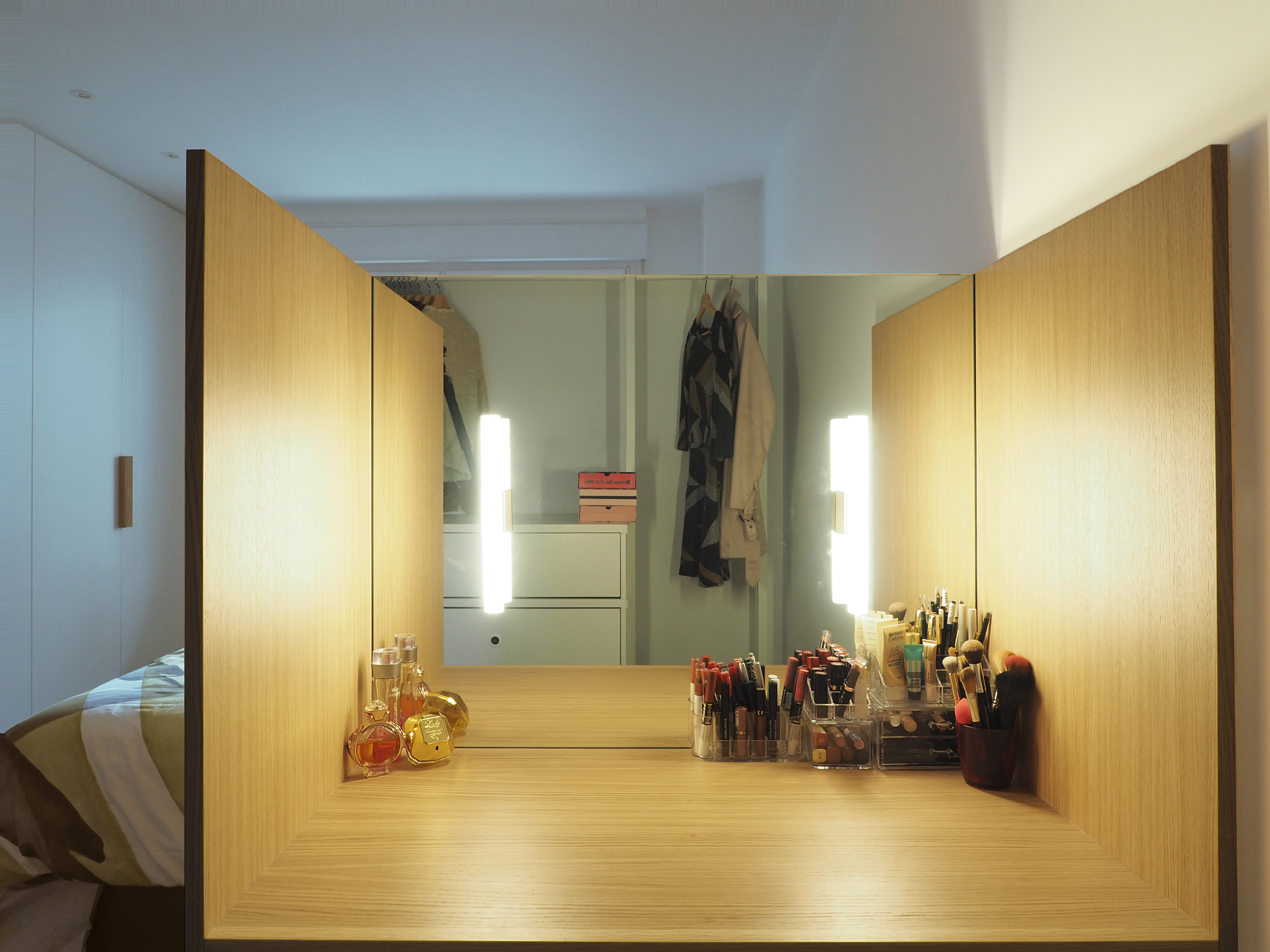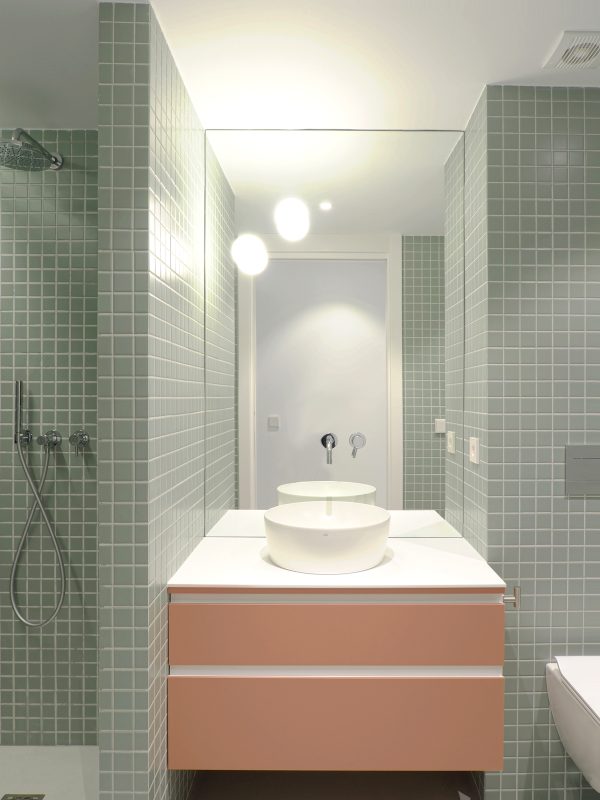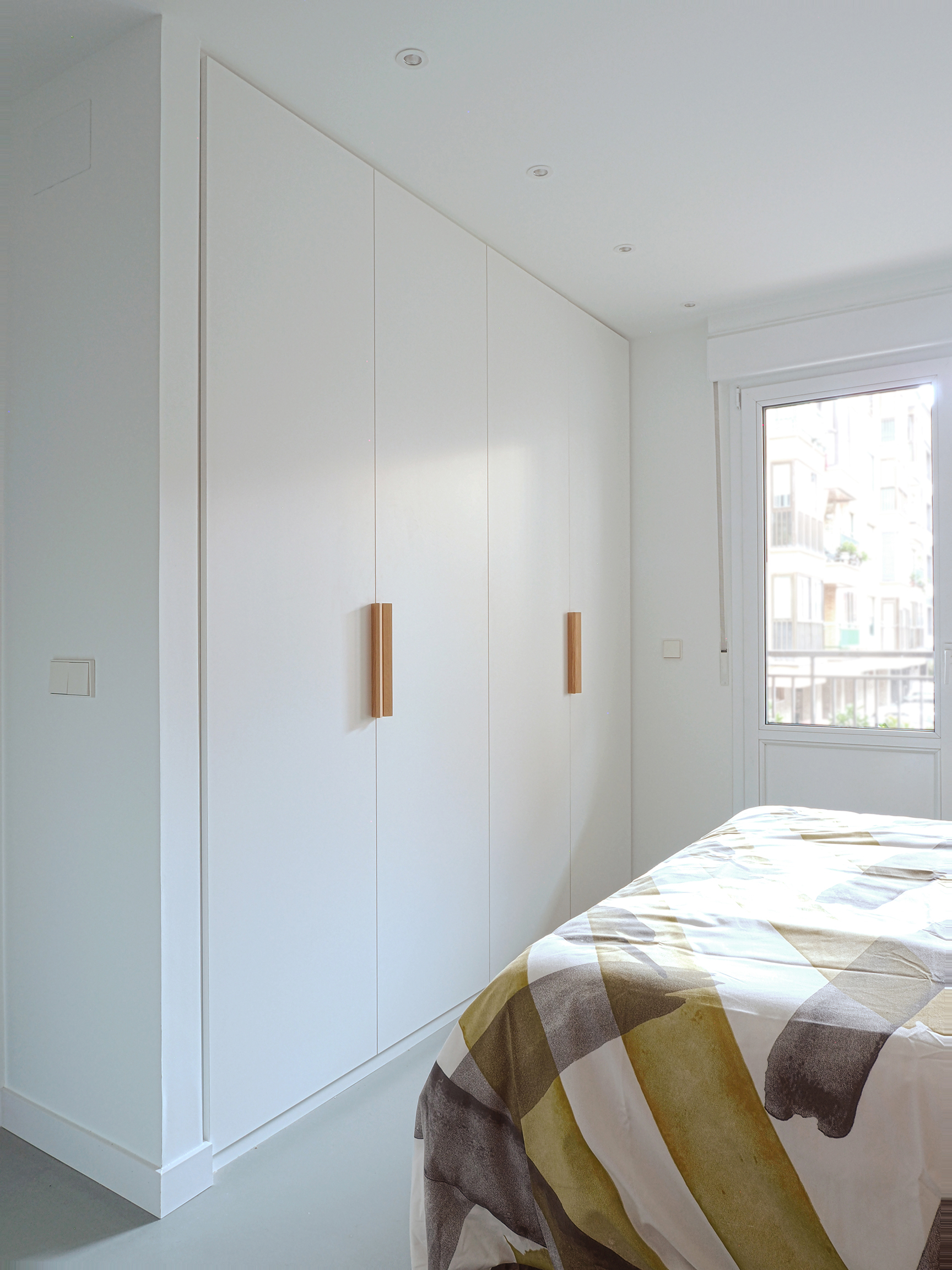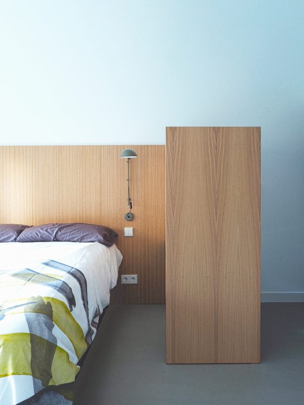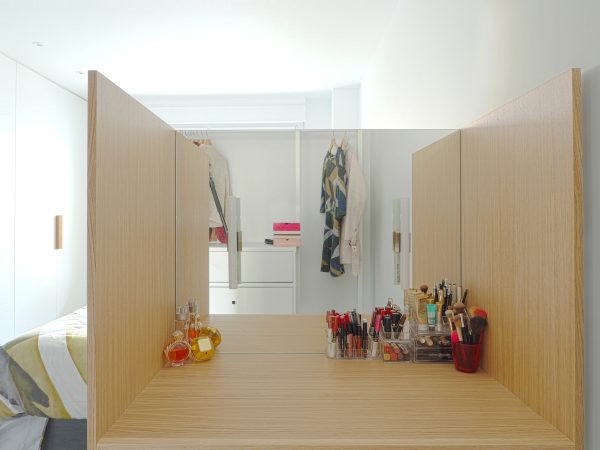Se optimizan todas las estancias, aprovechando los rincones, para generar las zonas de la cocina, el sofá, y el cabecero-tocador del dormitorio principal como elementos recogidos que articulan la casa.