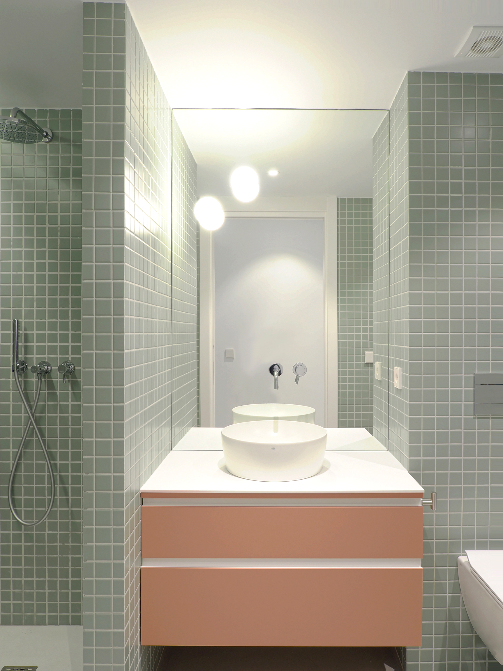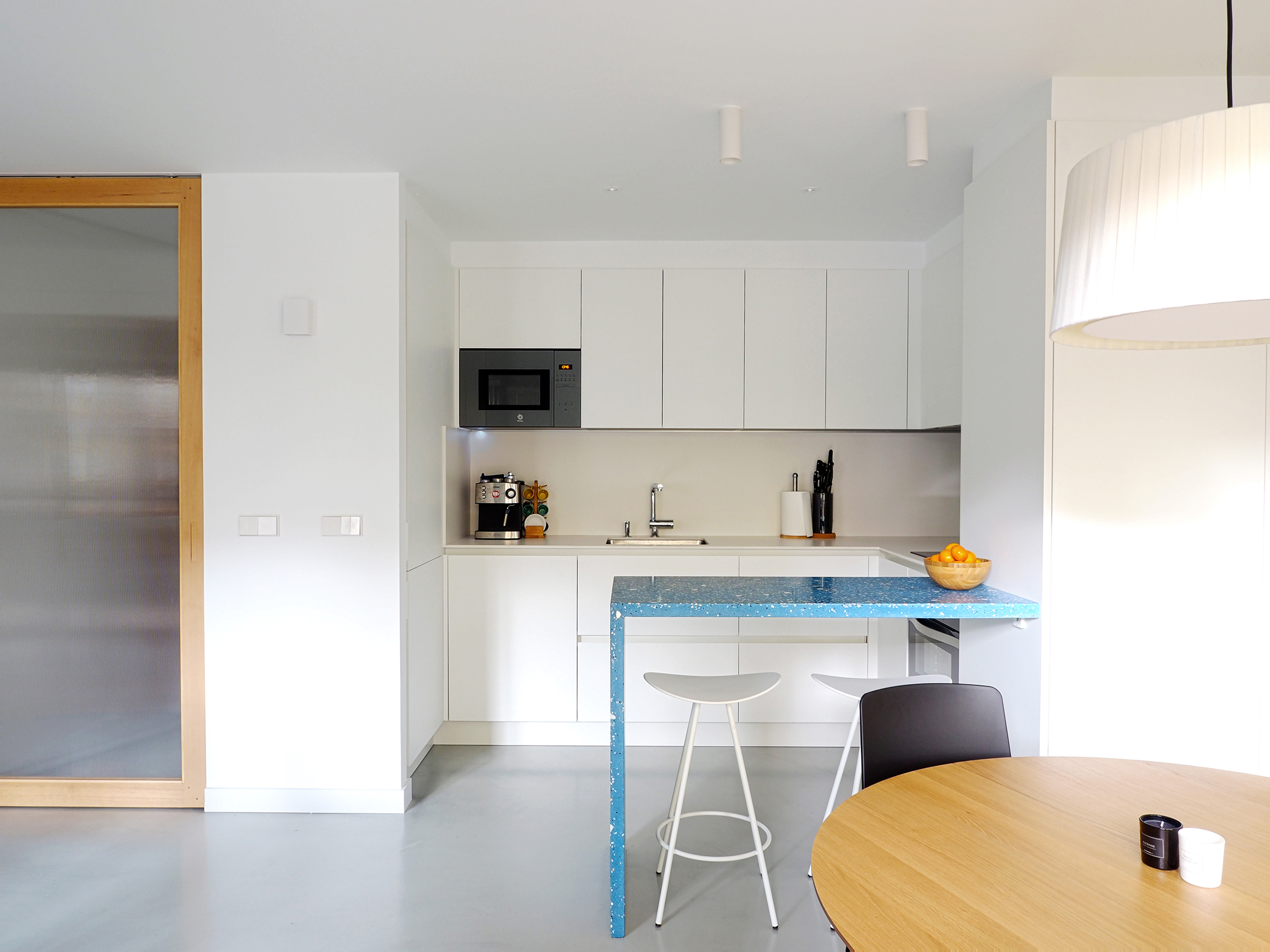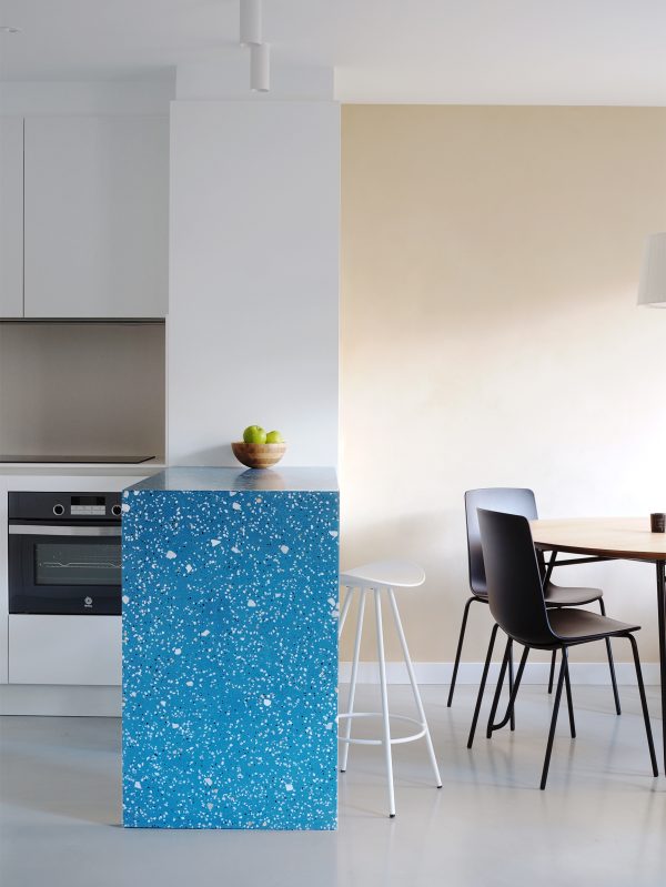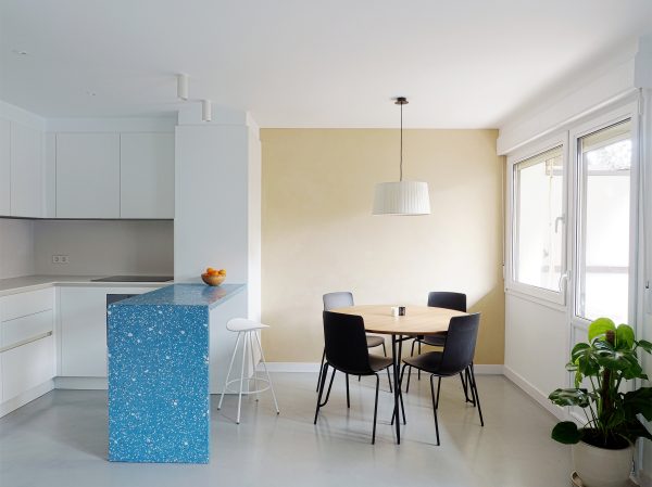 La relación entre la cocina y el comedor se establece a través de la barra de terrazzo artesanal, que hace las veces de zona de trabajo y barra de desayuno.