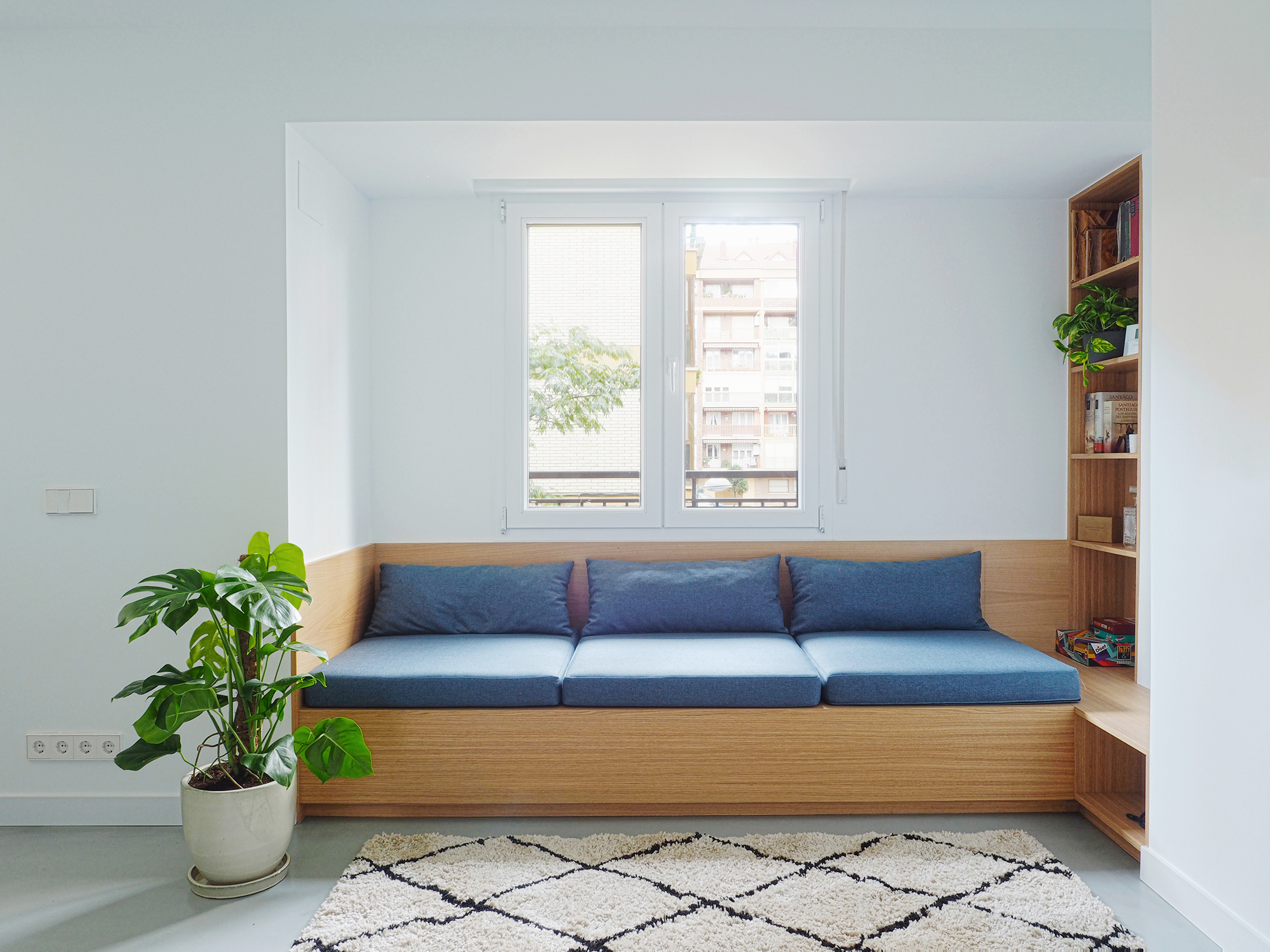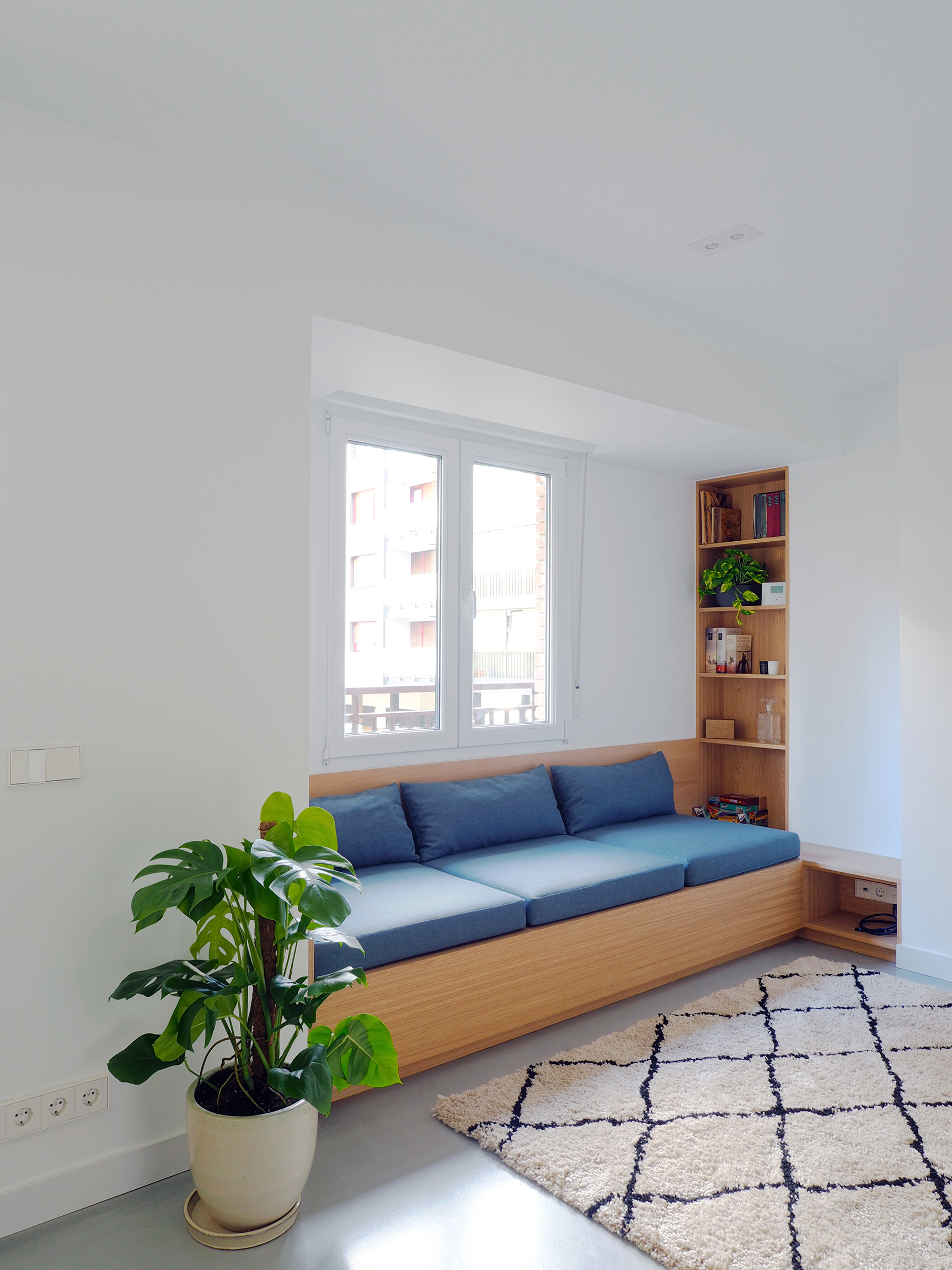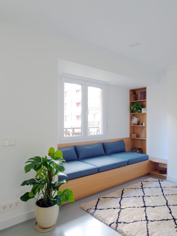 El umbral de la ventana se ofrece como lugar de asiento y lectura. La estructura del sofá, hecha en madera, dispone de tapas que permiten aprovechar todo su interior para almacenamiento. Sobre esa base se colocan los cojines hechos a medida.
